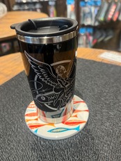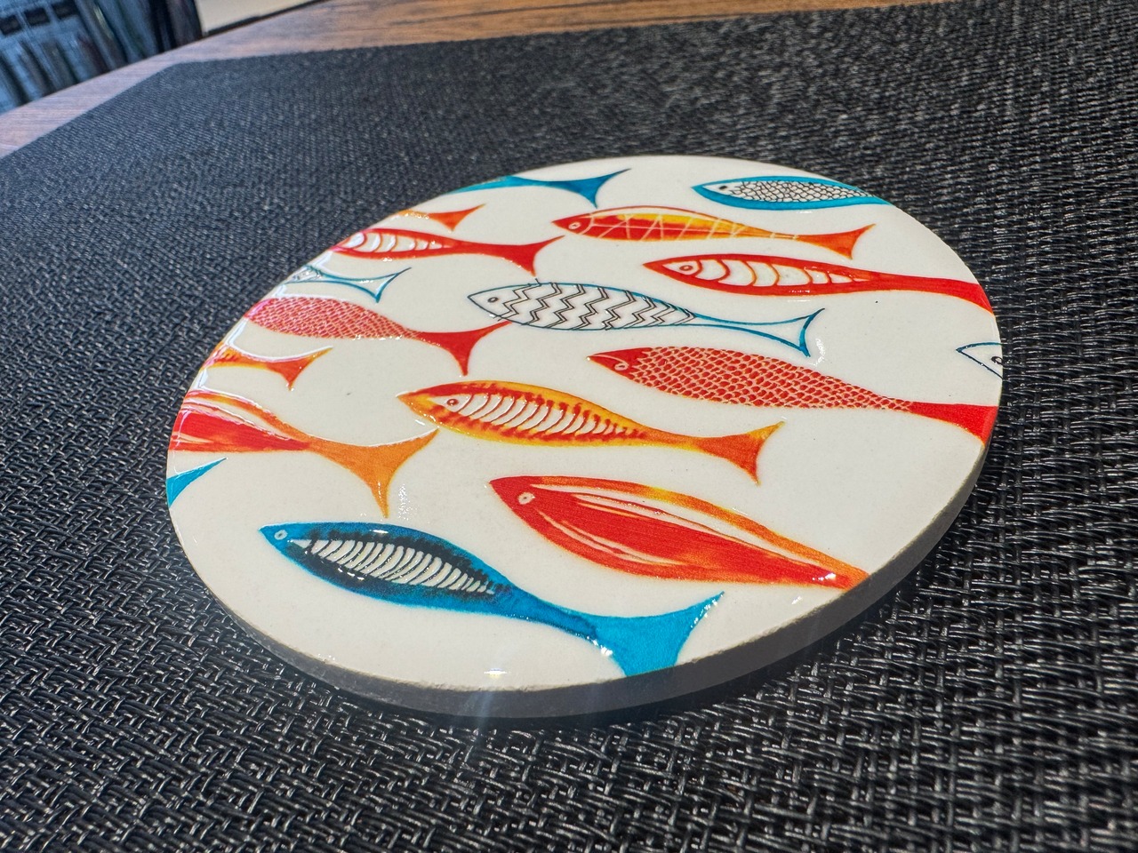 鮮やかな色彩で描かれた魚たちが、食卓に楽しいリズムを運んでくれるコースターです。